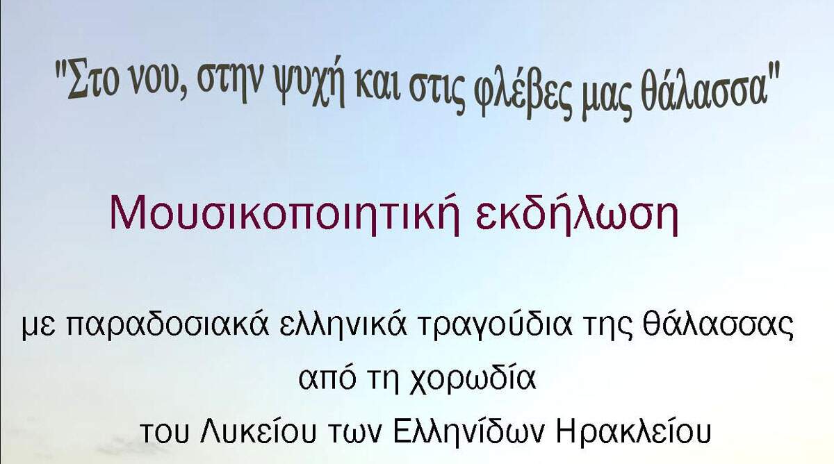 Μουσικοποιητική βραδιά που έχει επιμεληθεί το Μουσικό Τμήμα του Λυκείου των Ελληνίδων Ηρακλείου με τίτλο: «Στο νου, στην ψυχή και στις φλέβες μας θάλασσα» , θα πραγματοποιηθεί με την υποστήριξη της Περιφέρειας Κρήτης την Κυριακή 12 Νοεμβρίου 2023 και ώρα 8.00 μ.μ., στην αίθουσα του Πειραματικού Θεάτρου του Πολιτιστικού Κέντρου Ηρακλείου .