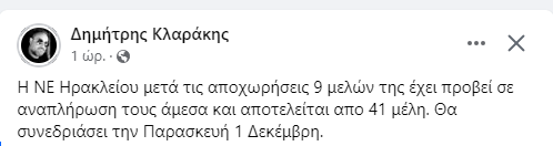 Ενώ κάτι αντίστοιχο έγινε και στη ΝΕ Ηρακλείου του ΣΥΡΙΖΑ – ΠΣ. Αποχώρησαν 9 μέλη από τα 41, οι θέσεις των οποίων ήδη αναπληρώθηκαν από τους αναπληρωματικούς.