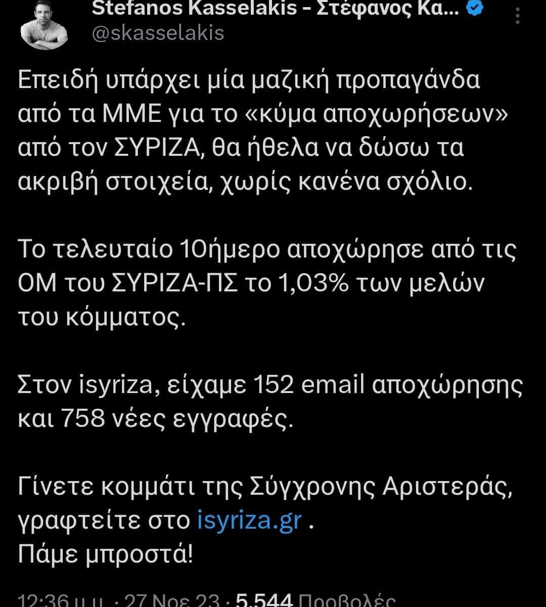 Στ. Κασσελάκης: Μαζική προπαγάνδα για «κύμα αποχωρήσεων» από τον ΣΥΡΙΖΑ – Ιδού τα ακριβή στοιχεία