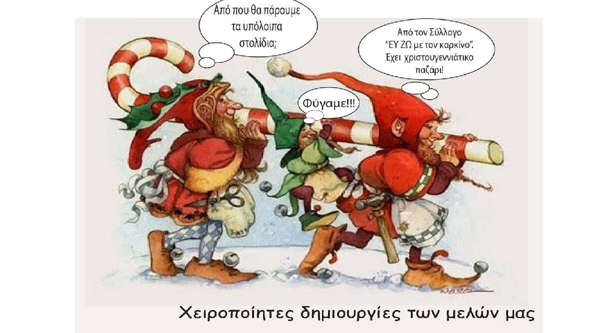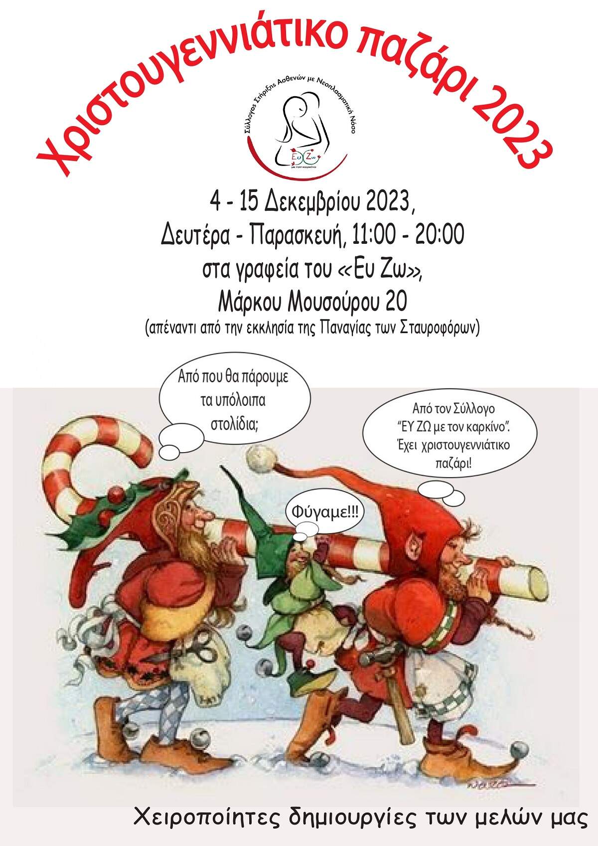 Ο σύλλογος στήριξης ασθενών με νεοπλασματική νόσο «Ευ Ζω με τον Καρκίνο» θα πραγματοποιήσει χριστουγεννιάτικο παζάρι. Για δύο ολόκληρες εβδομάδες, στο γραφείο του συλλόγου, στην οδό Μάρκου Μουσούρου 20, 1ο όροφο, Δευτέρα έως και Παρασκευή από τις 11:00 έως τις 20:00 θα διαθέτουμε χειροποίητες χριστουγεννιάτικες κατασκευές φτιαγμένες με πολλή αγάπη από φίλους του «Ευ ζω».