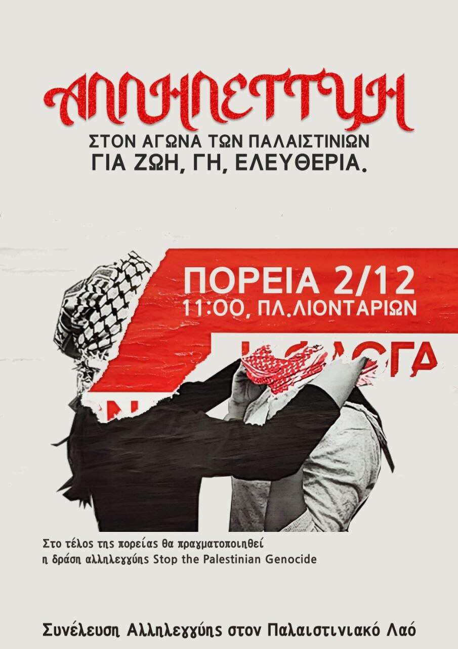 Κάλεσμα σε Πορεία Αλληλεγγύης στον Παλαιστινιακό Λαό στο Ηράκλειο. Σάββατο 2 Δεκεμβρίου 2023 – 11:00 Πλατεία Λιονταριών: