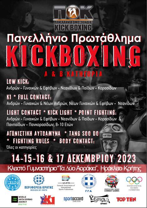 Η Πανελλήνια Ομοσπονδία Kickboxing (Π.Ο.Κ) με την υποστήριξη της Περιφέρειας Κρήτης διοργανώνει το πανελλήνιο πρωτάθλημα «Kickboxing».