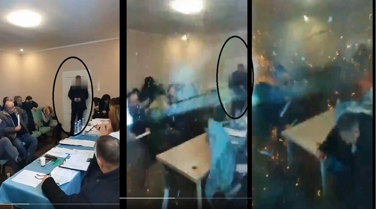 Έπειτα από μια σύντομη συνομιλία, σε τεταμένο κλίμα όπως φαίνεται στα πλάνα, ο αξιωματούχος βγάζει από τις τσέπες του και πετά στο πάτωμα αντικείμενα που μοιάζουν με χειροβομβίδες. Ακολουθεί σειρά εκρήξεων, καπνός υψώνεται και ακούγονται άνθρωποι να φωνάζουν πανικόβλητοι, προτού το βίντεο διακοπεί.