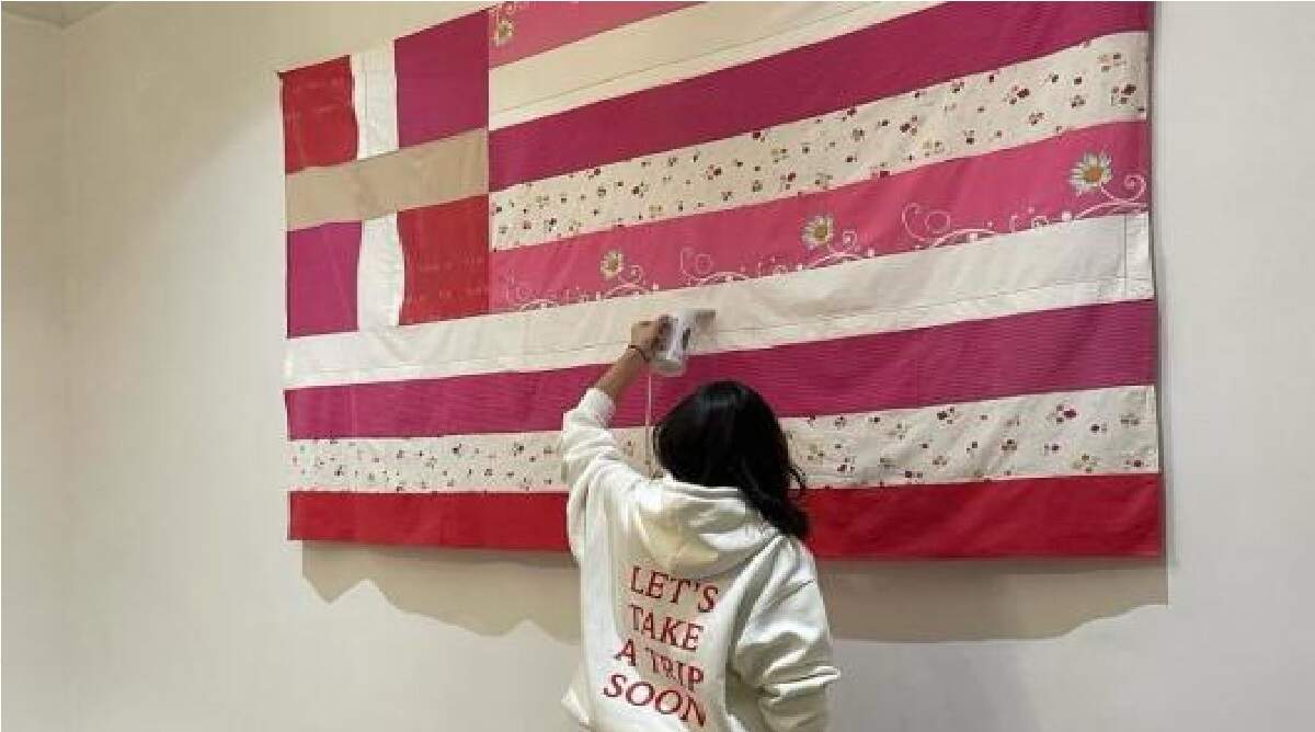 Η «σημαία» φιλοξενείται σε έκθεση στο Γενικό Προξενείο της χώρας μας στη Νέα Υόρκη και έχει ως θέμα την έμφυλη βία και τις γυναικοκτονίες.