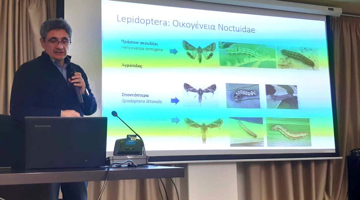 Εισηγήσεις παρουσίασαν οι: Δρ. Δημήτριος Παπαχρήστος Ερευνητής Α΄ της επιστημονικής Διέυθυνσης Εντομολογίας και Γεωργικής Ζωολογίας του Μπενάκειου Φυτοπαθολογικού Ινστιτούτου, με τίτλο : «Το έντομο Spodoptera frugiperda και η εμφάνισή του σε περιοχές της Κρήτης»,κ. Χρήστος Αραμπατζής, Γεωπόνος MSc, Προϊστάμενος του τμήματος Φυτοϋγεινομικού Ελέγχου του Υπουργείου Αγροτικής Ανάπτυξης και Τροφίμων, με τίτλο : « Φυτοϋγειονομικά μέτρα για τον επιβλαβή οργανισμό Spodoptera frugiperda στα πλαίσια των κανονισμών της ΕΕ 2016/2031 και 2023/1134» , και ο Δρ. Εμμανουήλ Ροδιτάκης, Αναπληρωτής Καθηγητής Γεωργικής Εντομολογίας και Φαρμακολογίας, Πρόεδρος Τμήματος Γεωπονίας, Σχολή Γεωπονικών Επιστημών, ΕΛΜΕΠΑ, με τίτλο : « Η αντιμετώπιση των λεπιδόπτερων της οικ. Noctuidae, με έμφαση στο είδος Spodoptera frugiperda».