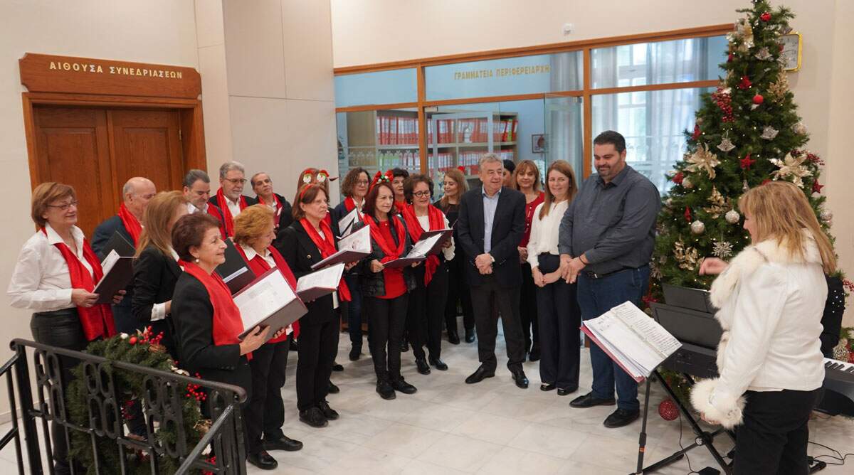 Τα κάλαντα έψαλε στον Περιφερειάρχη, παρουσία των Αντιπεριφερειαρχών Ειρήνης Χουδετσανάκη-Γιακουμάκη, Σταύρου Τζεδάκη και Νίκου Ξυλούρη, η χορωδία τριτέκνων ν. Ηρακλείου με επικεφαλής τον Πρόεδρο Μανόλη Αχλαδιανάκη. Η μαέστρος Κική Καγιαβά διεύθυνε την χορωδία ενώ στο αρμόνιο ήταν η Εύα Στρατάκη.