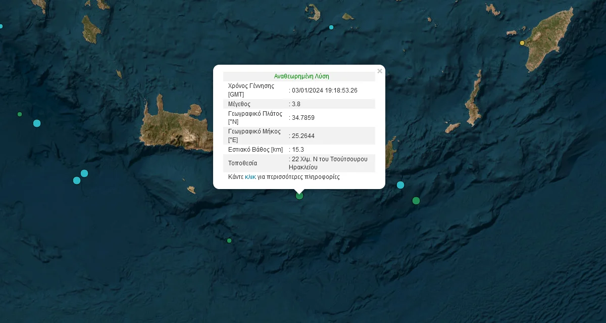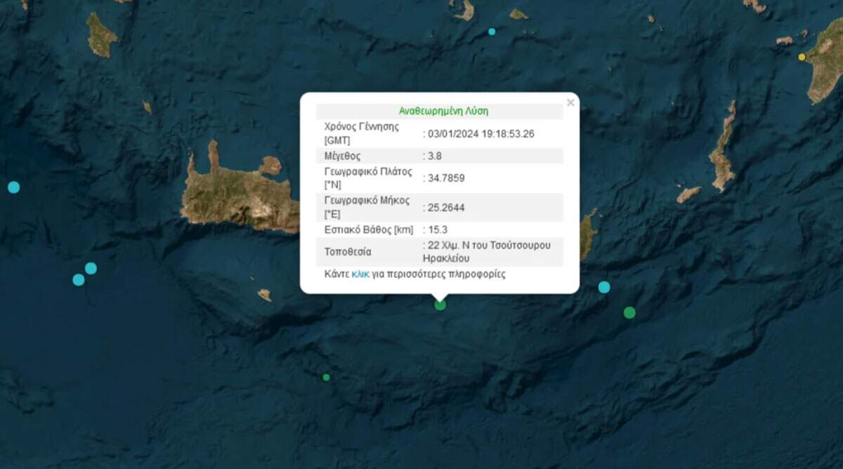 Ο σεισμός εκτιμάται ότι έγινε σε εστιακό βάθος 15,3 χιλιομέτρων, ενώ το επίκεντρο του σεισμού εντοπίζεται 22 χλμ Νότια του Τσούτσουρου Ηρακλείου.