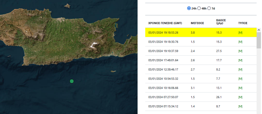 Σεισμός σημειώθηκε στο Ηράκλειο το βράδυ της Τετάρτης (3/1). Σύμφωνα με την αυτόματη καταμέτρηση του Γεωδυναμικού Ινστιτούτου του Αστεροσκοπείου Αθηνών, ο σεισμός είχε ένταση 3,8 ρίχτερ.