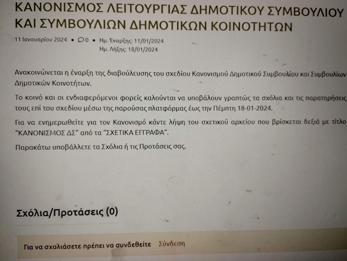 Σε ότι αφορά την έναρξη της διαβούλευσης του σχεδίου Κανονισμού του Δημοτικού Συμβουλίου και Συμβουλίων Δημοτικών Κοινοτήτων, το κοινό και οι ενδιαφερόμενοι φορείς καλούνται να υποβάλουν γραπτώς τα σχόλια και τις παρατηρήσεις τους επί του σχεδίου, μέσω της πλατφόρμας στον ηλεκτρονικό σύνδεσμο: dialogos.minoapediadas.gr/debates/kanonismos-leitourgias-dimotikou-symvouliou-kai-symvoulion-dimotikon-koinotiton/ στην επίσημη σελίδα του Δήμου με τις σχετικές οδηγίες, έως την Πέμπτη 18-01-2024.