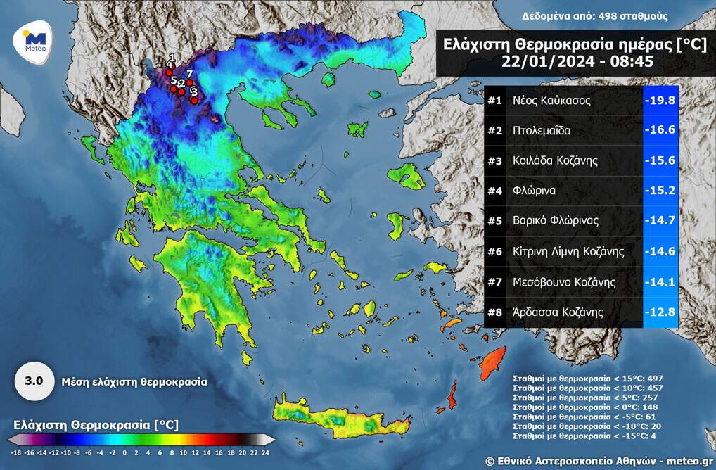 Εξαιρετικά χαμηλές θερμοκρασίες επικρατούν το πρωί της Δευτέρας 22/01 σε περιοχές της Δυτικής Μακεδονίας όπου υπάρχει χιονοσκεπές έδαφος. Πιο συγκεκριμένα στο Νέο Καύκασο Φλωρίνης ο αυτόματος μετεωρολογικός σταθμός του δικτύου του meteo.gr/Ε.Α.Α στις 08:10 τοπική ώρα, κατέγραψε θερμοκρασία -19.8°C, ενώ άλλες περιοχές καταγράφουν θερμοκρασίες κάτω από τους -15°C.