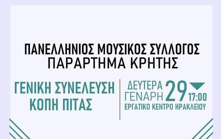Το Παράρτημα Κρήτης του Πανελλήνιου Μουσικού Συλλόγου καλεί τα μέλη του στη 1η Γενική Συνέλευση της νέας χρονιάς. Η συζήτηση θα αφορά τις εξελίξεις σε τοπικό και πανελλαδικό επίπεδο και θα ακολουθήσει η κοπή πίτας του Συλλόγου