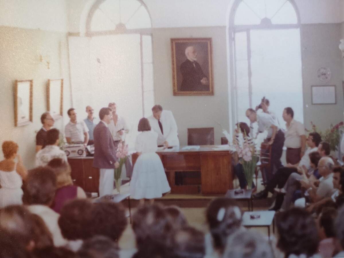 Καθώς η κοινωνία είναι και πάλι διχασμένη μ ένα σχετικό θέμα, από το αρχείο μου ανασύρω τη φωτογραφία του πρώτου πολιτικού γάμου στο Ηράκλειο που έγινε το 1982 στην παλιά αίθουσα του Δ. Σ. και που τόσα και τόσα προβλήματα επέλυσε όπως αποδείχτηκε εκ των υστέρων… Στον ρόλο του ιερέα, άψογος στα λευκά, ο Μανόλης Καρελλης.