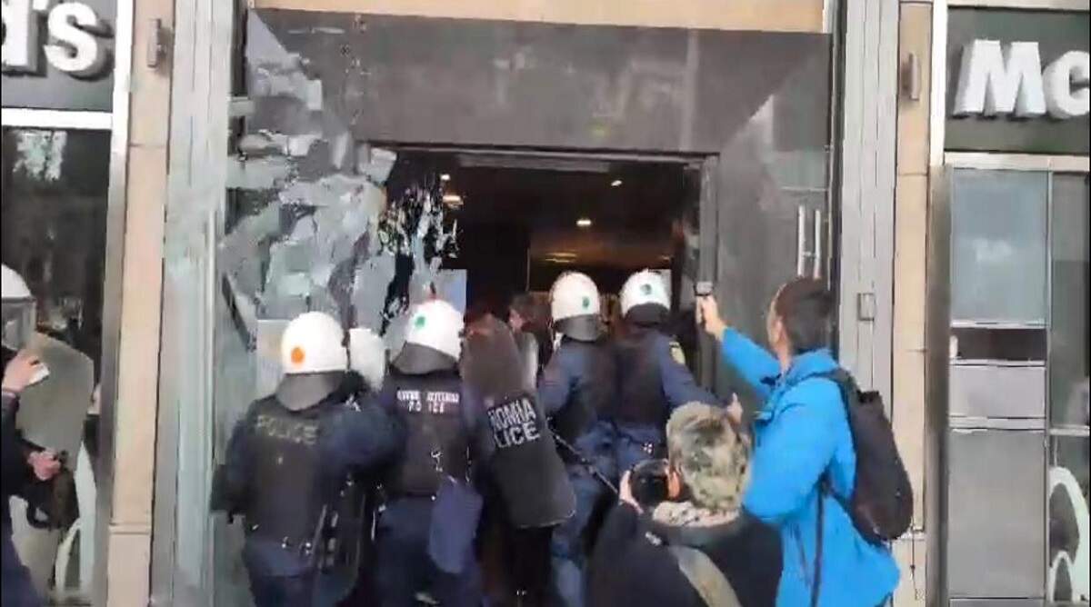 Άγρια επίθεση με χημικά και ξύλο από ΜΑΤ και ΥΜΕΤ κατά ανθρώπων στο Σύνταγμα που απλώς άπλωσαν ένα πανό για την Παλαιστίνη. Μάλιστα από το μένος των αστυνομικών δυνάμεων δεν γλίτωσε ούτε η τζαμαρία του καταστήματος fast food McDonald’s, καθώς την έσπασαν μπροστά στα έκπληκτα μάτια του κόσμου που γευμάτιζε εκείνη την ώρα και από τύχη δεν τραυματίστηκαν από τα θραύσματα.