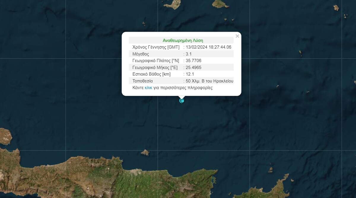Η δόνηση, σύμφωνα με την αναθεωρημένη λύση του Γεωδυναμικού Ινστιτούτου, καταγράφηκε στις 20:27, είχε εστιακό βάθος 12,1 Χλμ., ενώ το επίκεντρό της εντοπίζεται στα 50 Χλμ. βόρεια του Ηρακλείου.