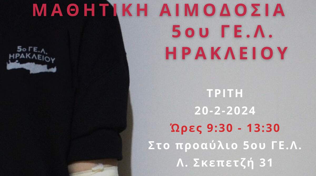 Εθελοντική αιμοδοσία προγραμματίζεται να πραγματοποιηθεί στο 5ο Γενικό Λύκειο Ηρακλείου (Λ. Σκεπετζή 31) την Τρίτη 20/2/24 και ώρες 9:30-13:30.
