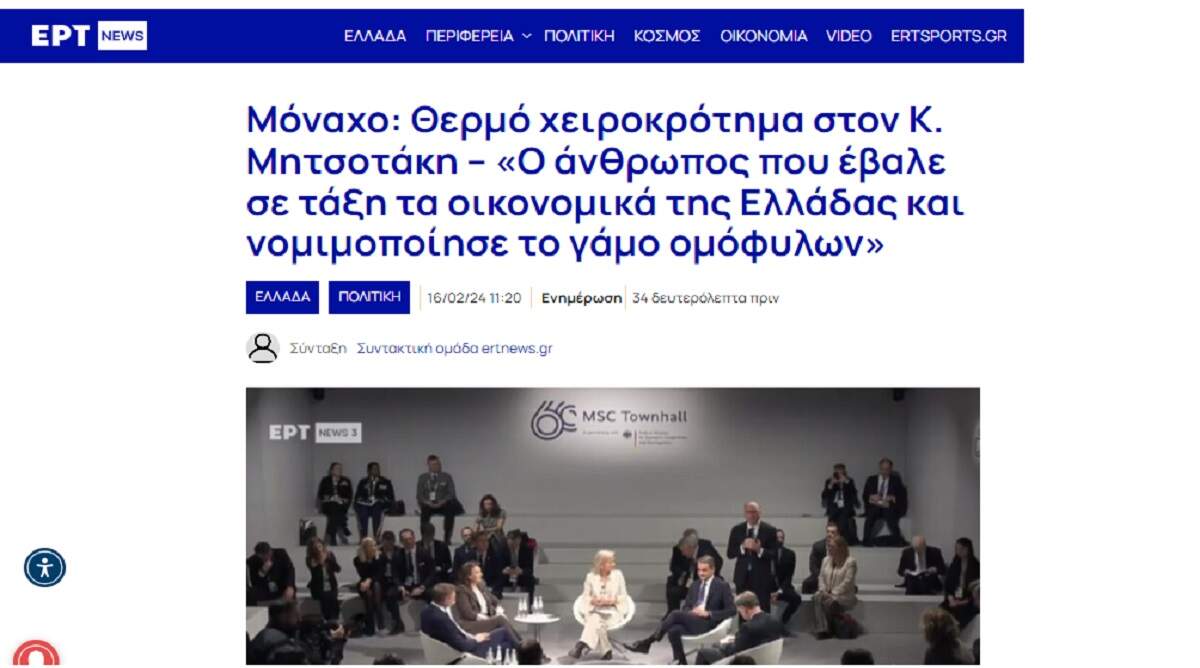 “Θερμό χειροκρότημα δέχτηκε ο πρωθυπουργός Κυριάκος Μητσοτάκης κατά την προσφώνησή του στο πλαίσιο της 60ης Διάσκεψης του Μονάχου «ως ο άνθρωπος που έβαλε σε τάξη τα οικονομικά της Ελλάδας και τού αξίζουν συγχαρητήρια επίσης, «γιατί μόλις ψηφίστηκε ο γάμος ομοφύλων ζευγαριών στην Ελλάδα». Είμαι εδώ με λίγες ώρες ύπνο, αλλά νομίζω είναι απόφαση – ορόσημο και είμαι υπερήφανος γιατί είμαι ο πρώτος κεντροδεξιός πρωθυπουργός που εισήγαγα τέτοιο νομοσχέδιο, δήλωσε ο Κυριάκος Μητσοτάκης”.