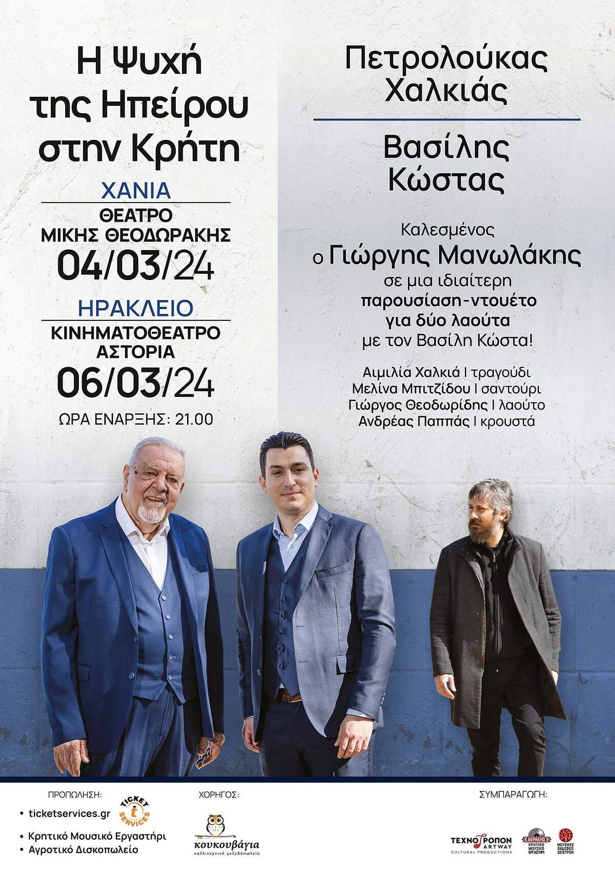 Μετά από τα δύο πετυχημένα και βραβευμένα διεθνώς album “The Soul of Epirus Vol. I & Vol. II” («Η Ψυχή της Ηπείρου») του ζωντανού θρύλου του κλαρίνου Πετρολούκα Χαλκιά και του διεθνή λαουτίστα και υποψήφιου για Grammy 2023, Βασίλη Κώστα, οι δύο σημαντικοί καλλιτέχνες μαζί με δεξιοτέχνες μουσικούς θα βρεθούν στην Κρήτη, για δύο μοναδικές συναυλίες στα Χανιά, την Δευτέρα 4 Μαρτίου και στο Ηράκλειο την Τετάρτη 6 Μαρτίου!