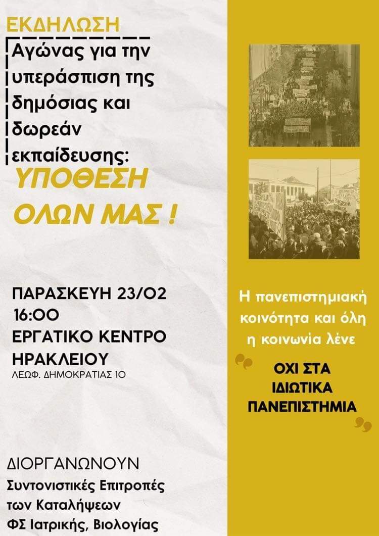 Οι Συντονιστικές Επιτροπές Καταλήψεων των ΦΣ Ιατρικής και Βιολογικού διοργανώνουν την Παρασκευή 23 Φεβρουαρίου στις 16:00 στο Εργατικό Κέντρο Ηρακλείου εκδήλωση με θέμα «Αγώνας για την υπεράσπιση της δημόσιας και δωρεάν εκπαίδευσης: ΥΠΟΘΕΣΗ ΟΛΩΝ ΜΑΣ». Θα μιλήσουν μέλη της πανεπιστημιακής κοινότητας.