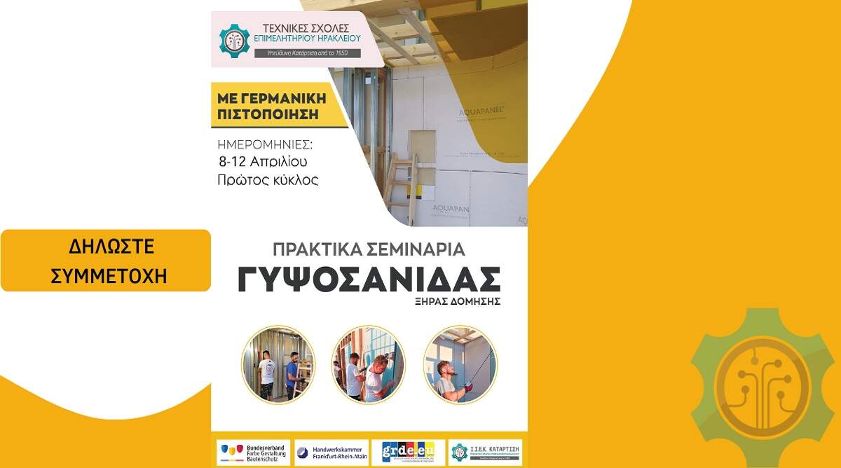 Πρακτική εκπαίδευση και αναγνωρισμένο δίπλωμα παρέχουν τα τρία σεμινάρια Ξηράς Δόμησης – Γυψοσανίδας που υλοποιούν σε ειδικά εργαστήρια κατασκευών οι Τεχνικές Σχολές του Επιμελητηρίου Ηρακλείου, αξιοποιώντας παράλληλα, σύγχρονες και καινοτόμες τεχνολογίες και μεθοδολογίες.