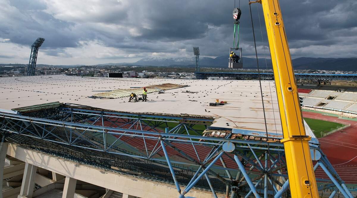Ολοκληρώθηκαν οι εργασίες απομάκρυνσης των προβληματικών τμημάτων του ανατολικού στεγάστρου του Παγκρητίου Σταδίου, που είχε υποστεί ζημιές από την πρόσφατη κακοκαιρία.