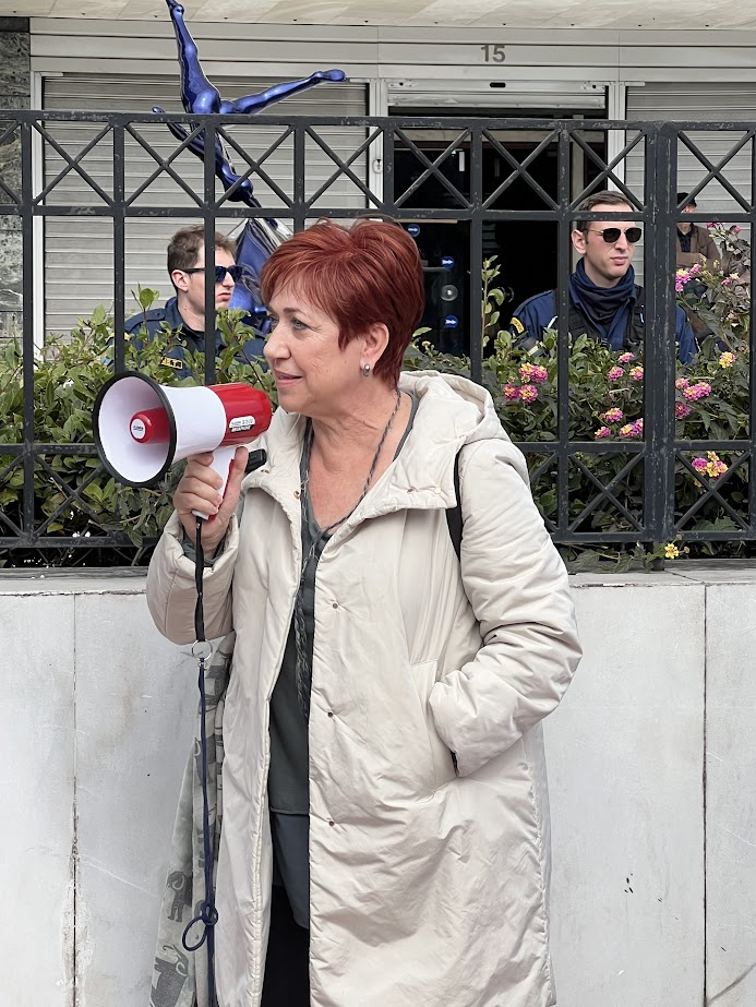 Η Πρόεδρος του Συλλόγου Υπαλλήλων Περιφέρειας Αττικής (μέλος της Γραμματείας του ΠΑΜΕ και της ΕΕ της ΑΔΕΔΥ) κ. Βέτα Πανουτσάκου.