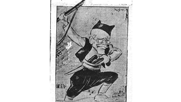 Ο Βενιζέλος ως επαναστάτης με κρητική βράκα και όπλο, σε σκίτσο της εποχής