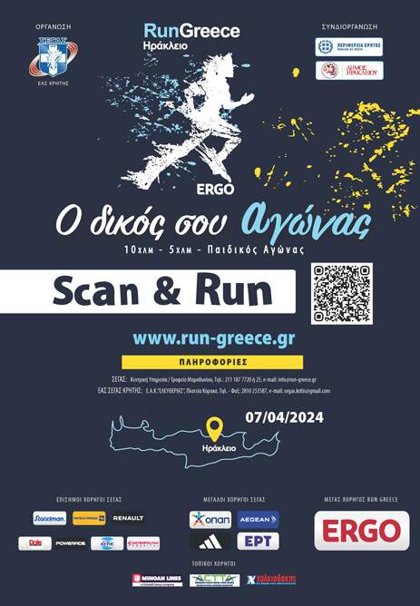 O Σ.Ε.Γ.Α.Σ. και η Ε.Α.Σ. Σ.Ε.ΓΑ.Σ. Κρήτης με συνδιοργανωτές την ΠΕΡΙΦΕΡΕΙΑ ΚΡΗΤΗΣ και τον ΔΗΜΟ ΗΡΑΚΛΕΙΟΥ, μεγάλο χορηγό την ERGO Ασφαλιστική και τοπικούς χορηγούς τις Μινωικές Γραμμές, το Σύνδεσμο Τουριστικών και Ταξιδιωτικών Γραφείων Κρήτης και τα Super Market Χαλκιαδάκης, διοργανώνουν και φέτος τον αγώνα RUN GREECE ΗΡΑΚΛΕΙΟ την Κυριακή 7 Απριλίου.