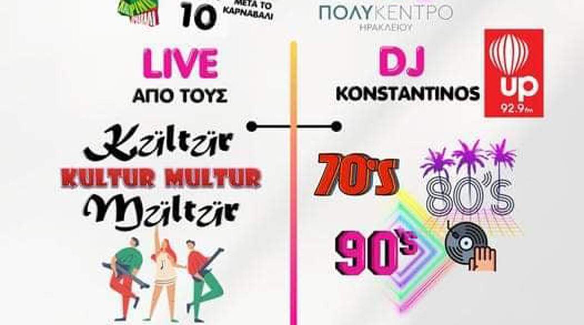 Την Κυριακή 10 Μαρτίου, ημέρα του Καστρινού Καρναβαλιού, συνεχίζονται οι εκδηλώσεις με τον τίτλο «Ημέρες χαράς» που διοργανώνει η ΔΕΠΑΝΑΛ ΑΕ. Έτσι όσοι βρεθούν στο Καστρινό Καρναβάλι θα έχουν την ευκαιρία να συνεχίσουν το αποκριάτικο ξεφάντωμα στο πάρτι που θα πραγματοποιηθεί αμέσως μετά στο Πολύκεντρο του Δήμου Ηρακλείου. Εκεί θα βρίσκονται και οι «Kultur Multur» για μία ξεχωριστή αποκριάτικη συναυλία.