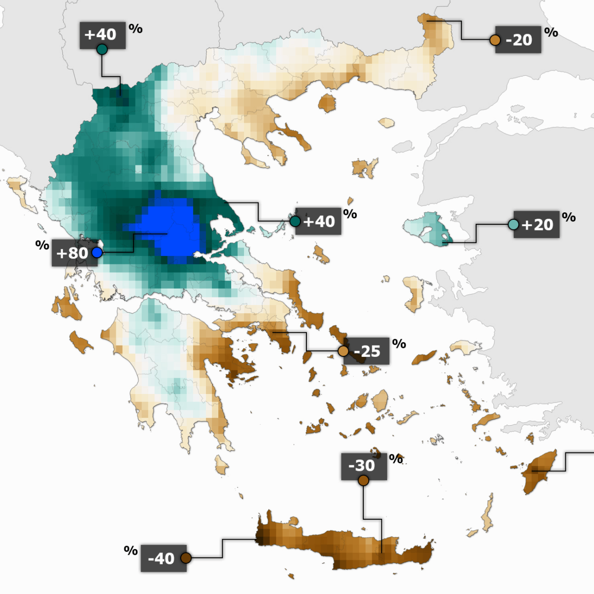 απόκλιση λόγω των ακραίων βροχοπτώσεων του Σεπτεμβρίου), και μεγάλα τμήματα της Ηπείρου και της Δυτικής Μακεδονίας.