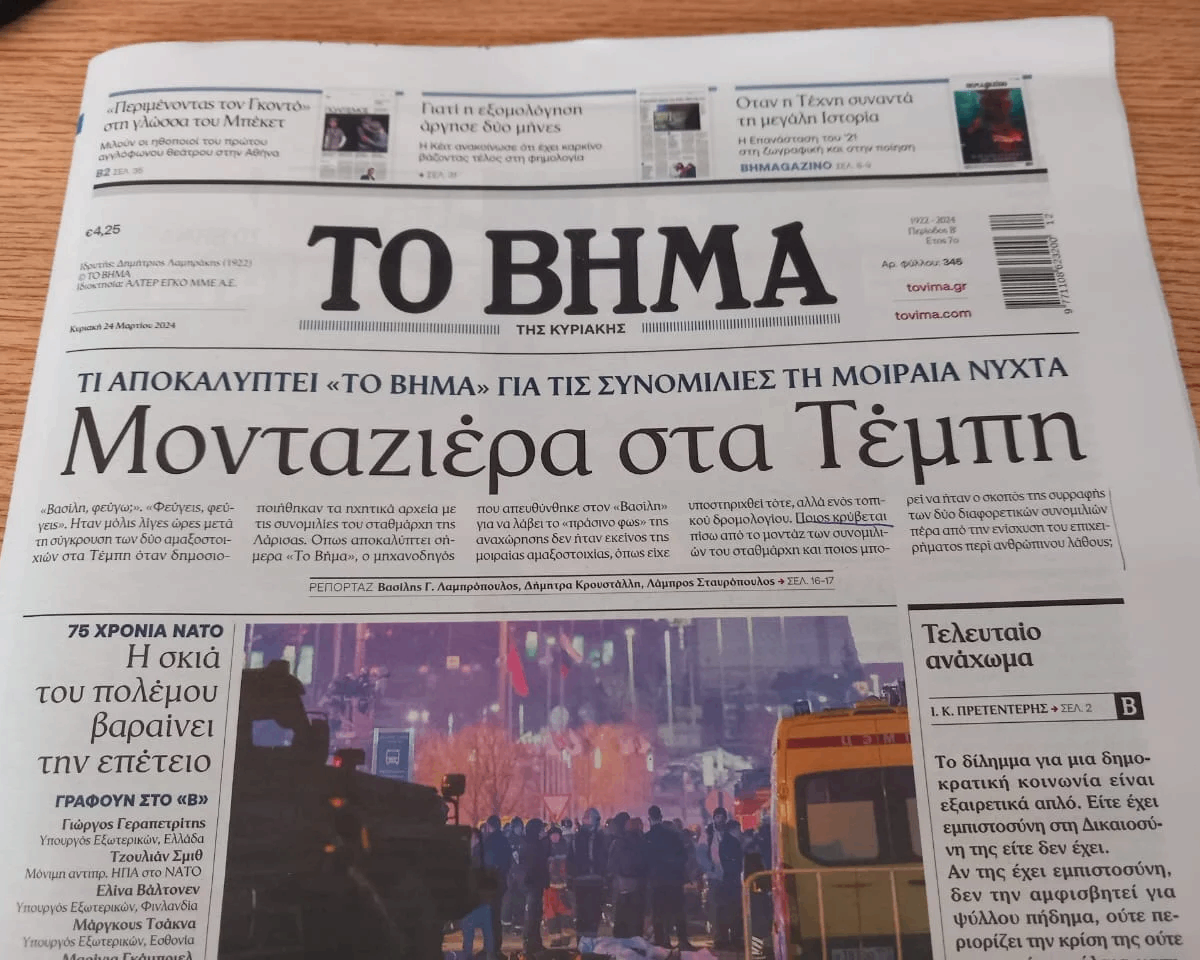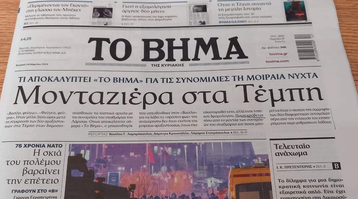 Το σημερινό πρωτοσέλιδο δημοσίευμα της εφημερίδας “Το ΒΗΜΑ της Κυριακής” αποτελεί δημοσιογραφική κηλίδα στην ιστορική πορεία της, καθώς προβάλλει σενάρια συνωμοσίας γύρω από τα αίτια της τραγωδίας των Τεμπών, που πληγώνει όλους τους Έλληνες.
