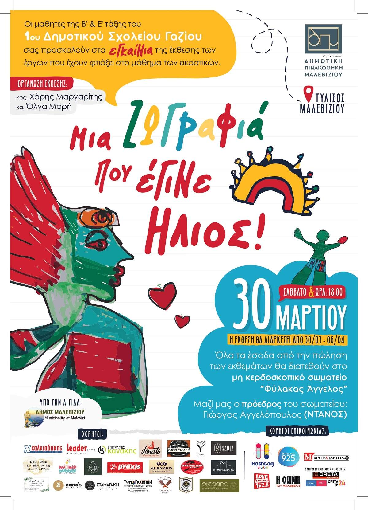Το Σάββατο 30 Μαρτίου στις 18.00 θα πραγματοποιηθούν στη Δημοτική Πινακοθήκη Μαλεβιζίου στην Τύλισο, τα εγκαίνια της έκθεσης ζωγραφικής των μαθητών της Β΄ και Ε΄ τάξης του 1ου Δημοτικού Σχολείου Γαζίου με τίτλο «Μία ζωγραφιά που έγινε ήλιος». Το παρών στα εγκαίνια της έκθεσης, θα δώσει ο Πρόεδρος του Σωματείου «Φύλακας Άγγελος», Γιώργος Αγγελόπουλος(Ντάνος).