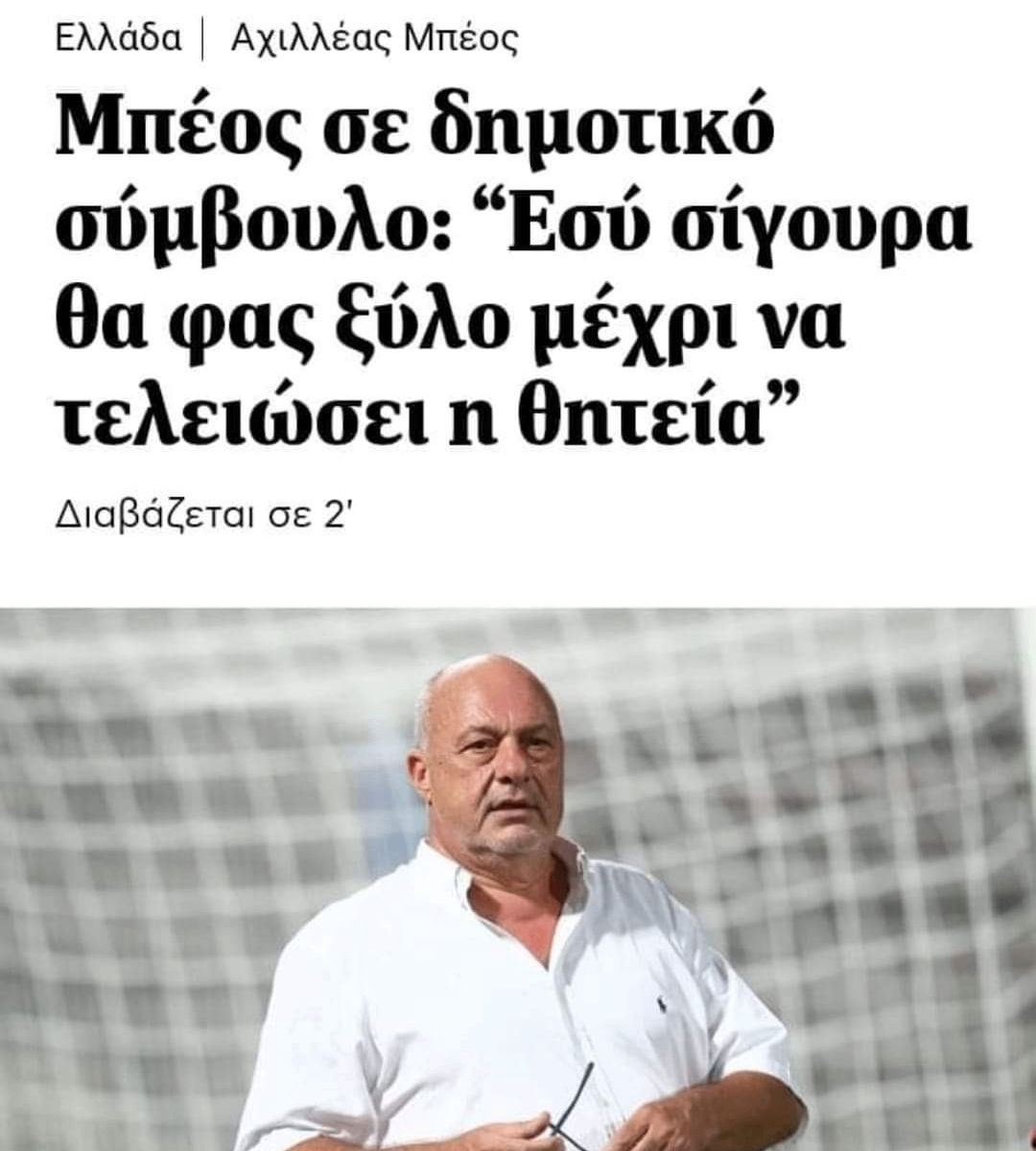 Ο “πολύ άντρας” δήμαρχος του Βόλου Μπέος είχε προαναγγείλει τον ξυλοδαρμό δημοτικού συμβούλου της αντιπολίτευσης. Και ο ξυλοδαρμός έγινε, από σύμβουλο του Μπέου…