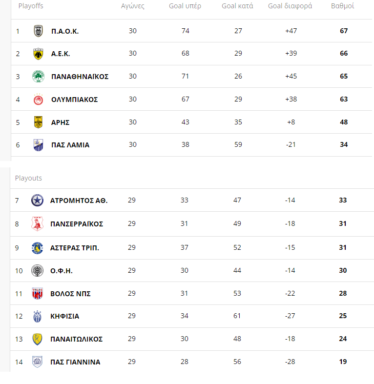 CandiaDoc-Κρήτη-Επικαιρότητα,αρθρογραφία,παραπολιτικά > ΑΘΛΗΤΙΣΜΟΣ > Βαθμολογία Stoiximan Super League Playoffs / Playouts 2023-2024