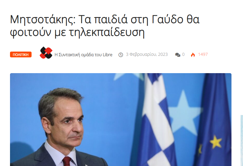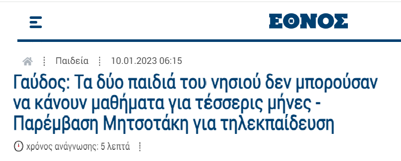 Πριν από ένα χρόνο, ο Κυριάκος Μητσοτάκης υποσχέθηκε δημόσια στους ακρίτες της Γαύδου ότι τα δύο γυμνασιόπαιδα του νησιού θα έχουν τηλεκπαίδευση, ώστε να μπορούν μένοντας στον τόπο τους, να λαμβάνουν από το Κράτος την εκπαίδευση που λαμβάνουν όλοι οι συνομήλικοί τους.… pic.twitter.com/I3tErvhLxg