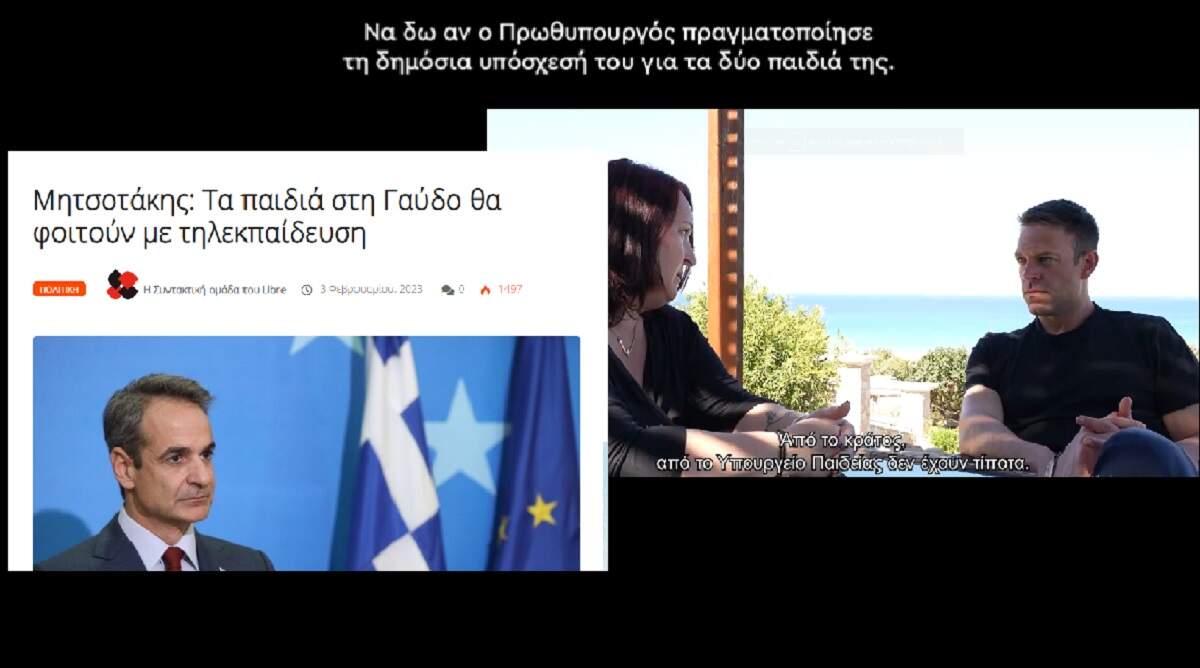 Τη Γαύδο και την Έφη Γεωργακά, μητέρα του 14χρονου Νικόλα και της 13χρονης Κέλλυ, επισκέφθηκε ο πρόεδρος του ΣΥΡΙΖΑ-ΠΣ Στέφανος Κασσελάκης για να δει αν ο Κυριάκος Μητσοτάκης τήρησε τη δημόσια υπόσχεσή του στους ακρίτες του νησιού ότι τα δύο γυμνασιόπαιδα θα έχουν τηλεκπαίδευση, ώστε να μπορούν μένοντας στον τόπο τους και να λαμβάνουν από το κράτος την εκπαίδευση που λαμβάνουν όλοι οι συνομήλικοί τους.