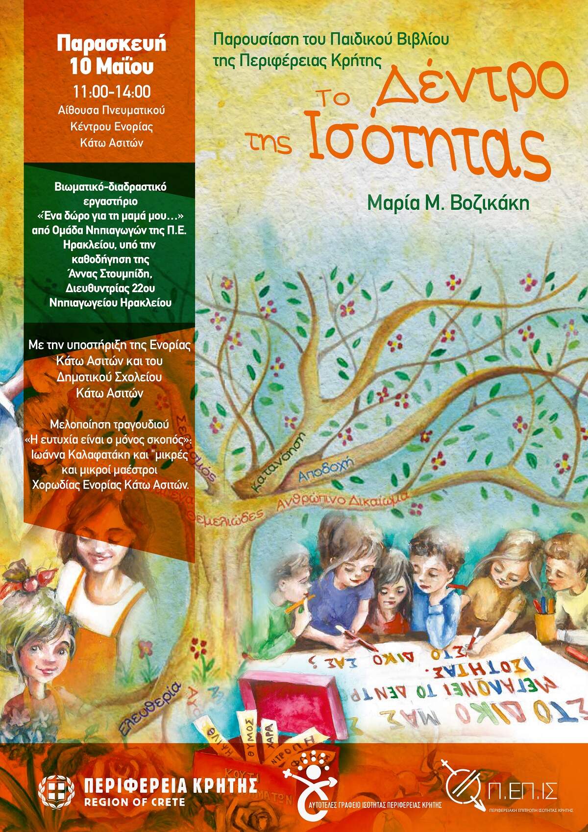 Συνεχίζονται οι εκδηλώσεις παρουσίασης του παιδικού βιβλίου το «Δέντρο της Ισότητας» οι οποίες πραγματοποιούνται στο πλαίσιο των δράσεων της Περιφέρειας Κρήτης, του Αυτοτελούς Γραφείου Ισότητας και της Περιφερειακής Επιτροπής Ισότητας των Φύλων Κρήτης (Π.ΕΠ.ΙΣ.) για την εξάλειψη των έμφυλων στερεοτύπων και την ουσιαστική προώθηση της ισότητας των φύλων στην οικογένεια, το σχολείο και την κοινότητα, όπως προβλέπονται στο «Περιφερειακό Πρόγραμμα για την Ισότητα των Φύλων στην Κρήτη 2023-2025».