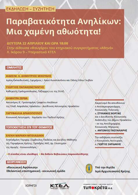Η εθελοντική επιστημονική – κοινωνική ομάδα «Κοινωνική Αφύπνιση» στο πλαίσιο υλοποίησης δράσεων ενημέρωσης και ευαισθητοποίησης, περί του κοινωνικού φαινομένου της Παραβατικότητας Ανηλίκων προσώπων, σας προσκαλεί σε εκδήλωση με τίτλο «Παραβατικότητα ανηλίκων: Μια χαμένη αθωότητα!» που θα πραγματοποιηθεί τη Δευτέρα 22 Απριλίου και ώρα 18:00, στην αίθουσα «Φουγάρο» του κτηριακού συγκροτήματος «Αθηνά» (Λ. Ικάρου 9 – Υπεραστικό ΚΤΕΛ).