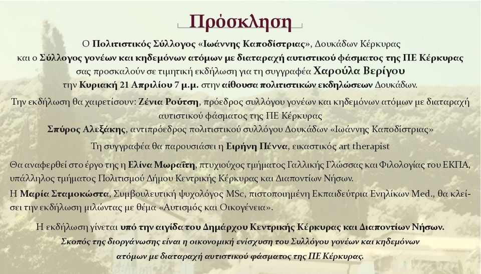 Με την ελπίδα πως δεν είναι μακριά η μέρα που η κοινωνία μας θα ανοίξει διευρύνοντας τον ορίζοντα της και θα μας αγκαλιάσει περισσότερο, ελάτε, να θυμίσουμε σε όσους το γνωρίζουν και να γνωρίσουμε σε όσους το αγνοούν πως ο αυτισμός δεν είναι ούτε αρρώστια ούτε ψυχιατρικό νόσημα, αλλά ένας διαφορετικός τρόπος ύπαρξης, που έχουμε χρέος να αποδεχτούμε και να στηρίξουμε.