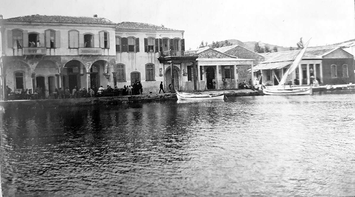 Στην φωτογραφία με τον «καφενέ του Μπάτη» διακρίνονται ευκρινώς οι καθήμενοι πελάτες στα τραπεζάκια τους, ένας που φεύγει, καθώς και οι πελάτες του πανδοχείου στα μπαλκόνια πάνω από τον καφενέ…