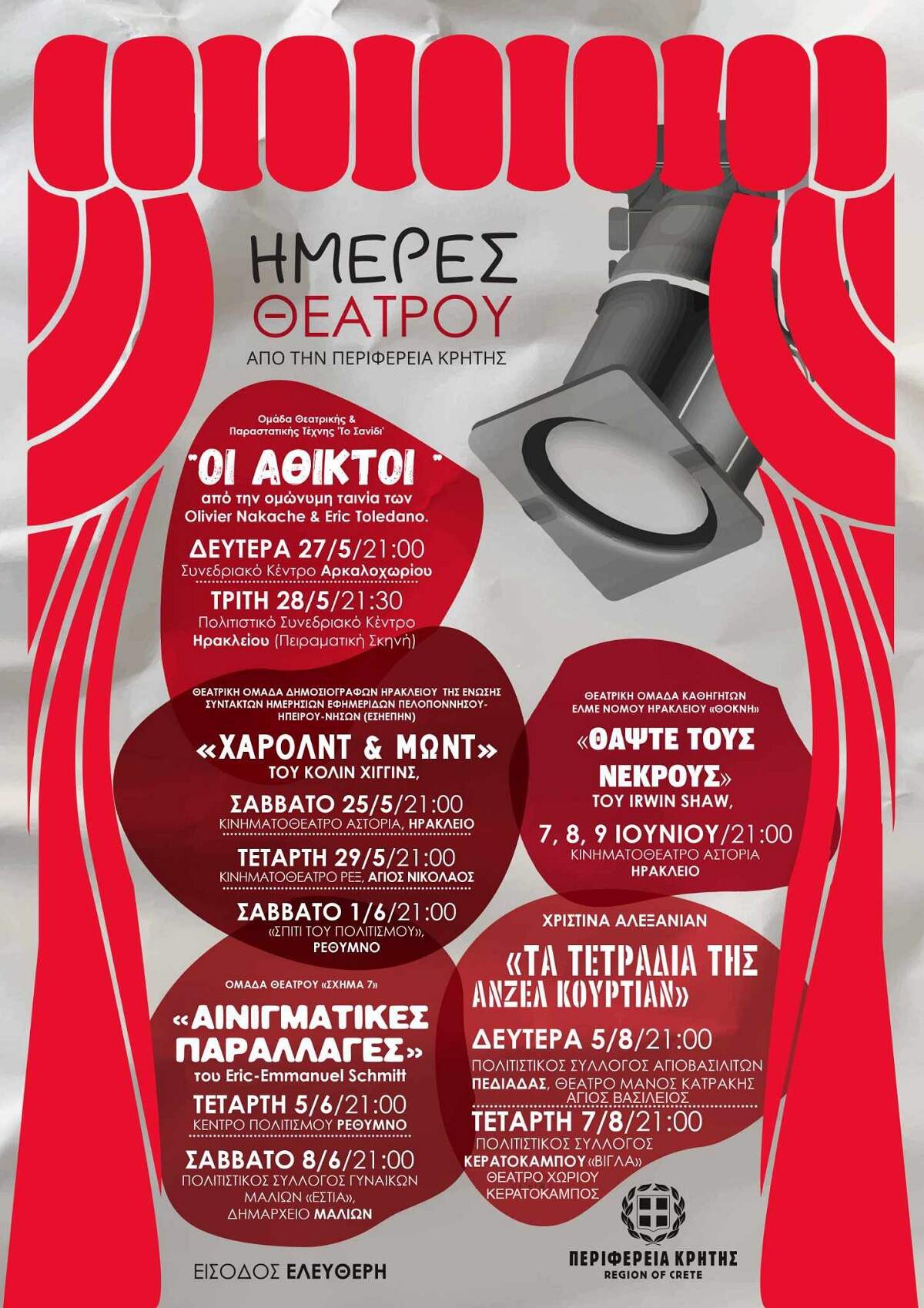 Η Περιφέρεια Κρήτης, σε συνέχεια των Ημερών Παιδικού Θεάτρου, επενδύοντας στις τέχνες και τον πολιτισμό, διοργανώνει σειρά θεατρικών παραστάσεων σε όλο το νησί. Πρόκειται για παραστάσεις που «μιλούν» για τα ανθρώπινα συναισθήματα, την αγάπη, τον έρωτα, την εν συναίσθηση, τη φροντίδα, το νοιάξιμο, τις αξίες της ισότητας, της συμπερίληψης και της αλληλεγγύης και παρουσιάζουν ιστορίες ζωής που συνδέουν το χθες με το σήμερα και στοιχειοθετούν την ιστορική ταυτότητα και μνήμη. Η είσοδος σε όλες τις παραστάσεις είναι δωρεάν.