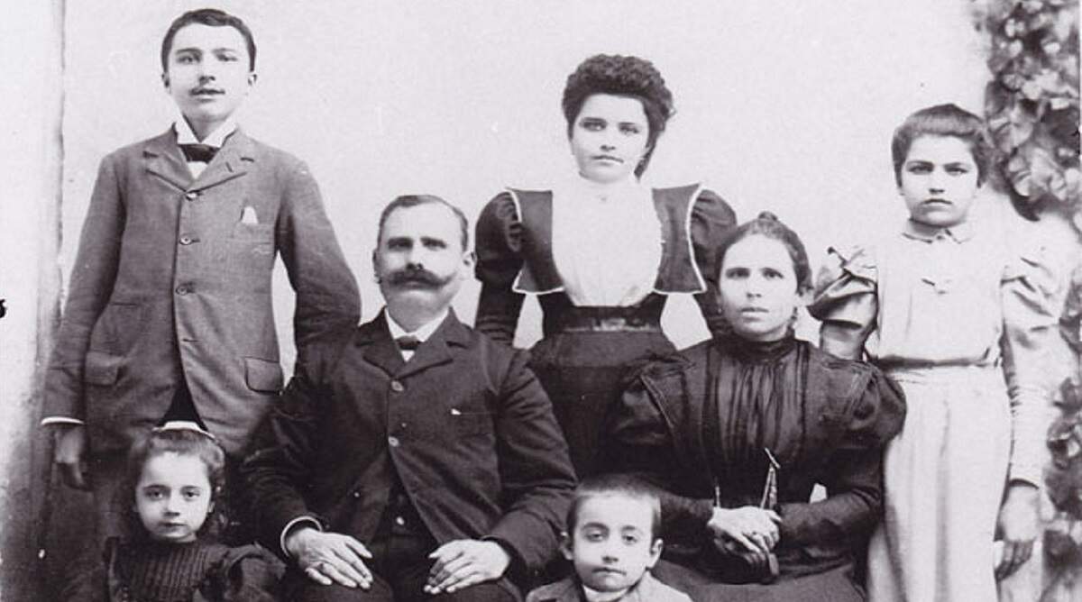 Στα 1900, όρθιοι, από αριστερά: Ο Νίκος Καζαντζάκης και οι αδελφές του Αναστασία και Ελένη. (Καθήμενοι:) Ο αδελφός της μητέρας του, Αντώνης Χριστοδουλάκης και η μητέρα του Μαρία. (Καθήμενοι μπροστά:) Τα εξαδέλφια του Άννα και Γεώργιος, τέκνα του Αντώνη Χριστοδουλάκη