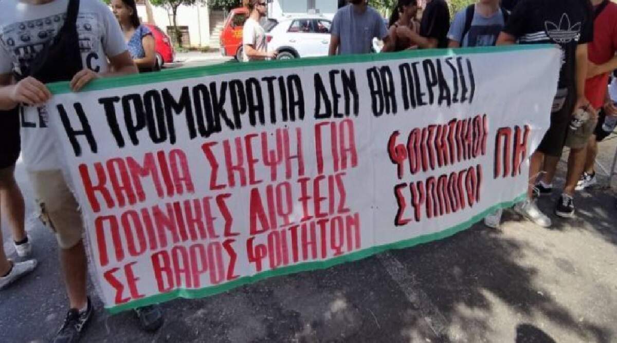 Στη συνέχεια οι φοιτητές με συνθήματα φτάνουν μέχρι την είσοδο της Νομικής από τη Σόλωνος όπου άνοιξαν πανό κατά της αστυνομοκρατίας και υπέρ της Παλαιστίνης.