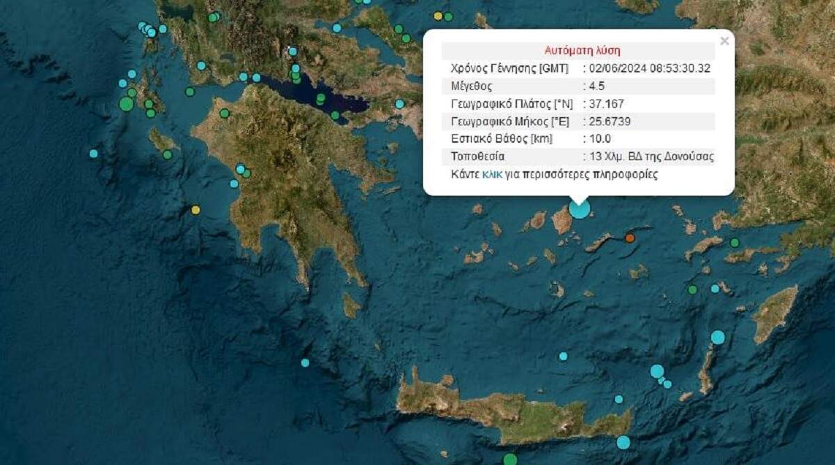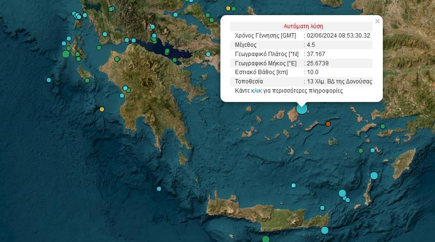Σεισμική δόνηση έγινε ιδιαίτερα αισθητή στην Αθήνα στις 11:53. Σύμφωνα με τα πρώτα στοιχεία του Γεωδυναμικού Ινστιτούτου, ο σεισμός ήταν 4,5 Ρίχτερ και σημειώθηκε 13 χιλιόμετρα βορειοδυτικά της Δονούσας.