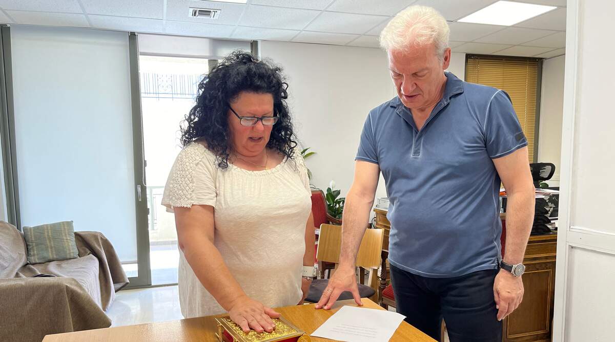 Ο Δήμαρχος μετά την ορκωμοσία ευχήθηκε στη νέα Κοινοτική Σύμβουλο Ελένη Μπακαλάκη υγεία και παραγωγική θητεία και καλή δύναμη στα νέα της καθήκοντα.