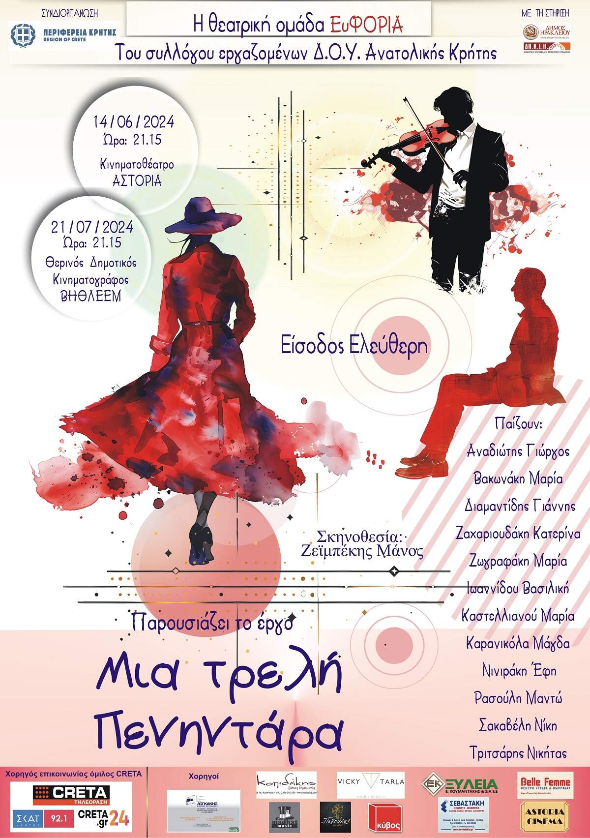 Τη θεατρική παράσταση “Μια Τρελή Πενηντάρα” παρουσιάζει η θεατρική ομάδα του Συλλόγου εργαζομένων ΔΟΥ Ανατολικής Κρήτης, με την στήριξη της Περιφέρειας Κρήτης .