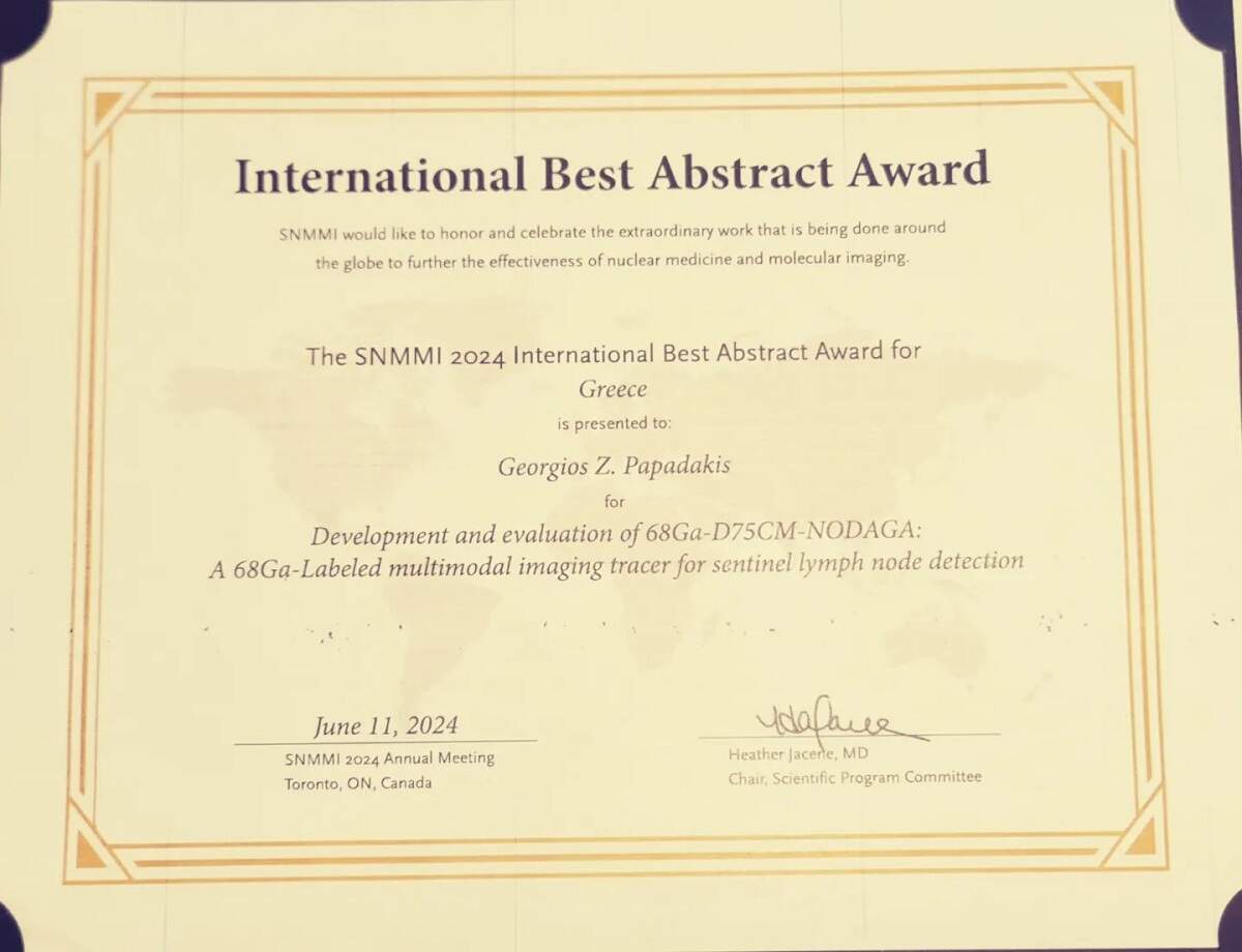 Στο πλαίσιο του κορυφαίου διεθνούς συνεδρίου, ο Πυρηνικός Ιατρός και Κύριος Ερευνητής του ΙΤΕ κ. Γεώργιος Ζ. Παπαδάκης, MD, MPH, PhD διακρίθηκε με το βραβείο καλύτερης διεθνούς ανακοίνωσης (International Best Abstract Award).