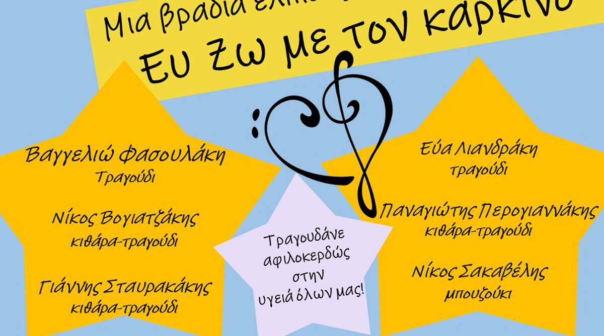 Η ετήσια καλοκαιρινή συναυλία που διοργανώνει ο Σύλλογος στήριξης ασθενών με νεοπλασματική νόσο «Ευ Ζω με τον Καρκίνο», φέτος είναι γεμάτη κέφι, πολλούς συμμετέχοντες, υπέροχα ακούσματα και αισιοδοξία!