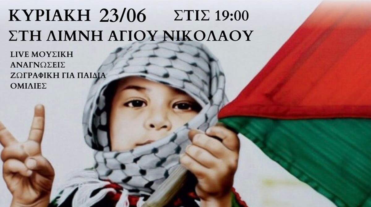 Εκδήλωση διοργανώνει την Κυριακή, 23 Ιουνίου και ώρα 19.00 μ.μ. στην Λίμνη του Αγίου Νικολάου η Ομάδα Γυναικών Αγίου Νικολάου με θέμα: «Λευτεριά στην Παλαιστίνη». Η εκδήλωση θα περιλαμβάνει κεντρική ομιλία, αναγνώσεις, δράση για παιδιά (αντιπολεμική ζωγραφική) & ζωντανή μουσική.