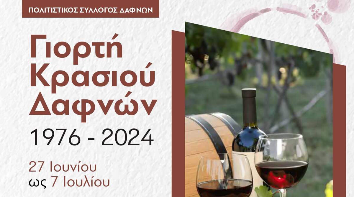 Ο πολιτιστικός σύλλογος Δαφνών διοργανώνει τη Γιορτή Κρασιού με τη στήριξη της Περιφέρειας Κρήτης από τις 27 Ιουνίου έως τις 7 Ιουλίου στις Δαφνές.