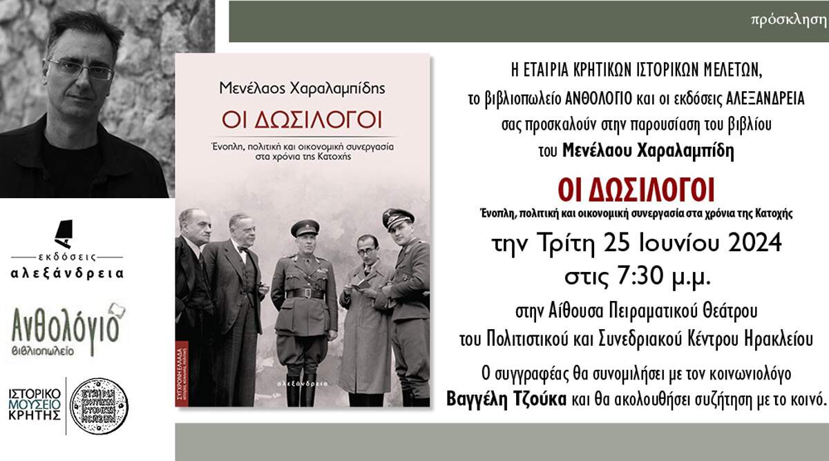 Η Εταιρία Κρητικών Ιστορικών Μελετών, το βιβλιοπωλείο Ανθολόγιο και οι εκδόσεις Αλεξάνδρεια, συνδιοργανώνουν την Τρίτη 25 Ιουνίου 2024, ώρα 19:30 στην αίθουσα του Πειραματικού Θεάτρου του Πολιτιστικού και Συνεδριακού Κέντρου Ηρακλείου, την παρουσίαση του βιβλίου του Μενέλαου Χαραλαμπίδη υπό τον τίτλο Οι Δωσίλογοι. Ένοπλη, πολιτική και οικονομική συνεργασία στα χρόνια της Κατοχής, εκδ. Αλεξάνδρεια, Αθήνα 2023.